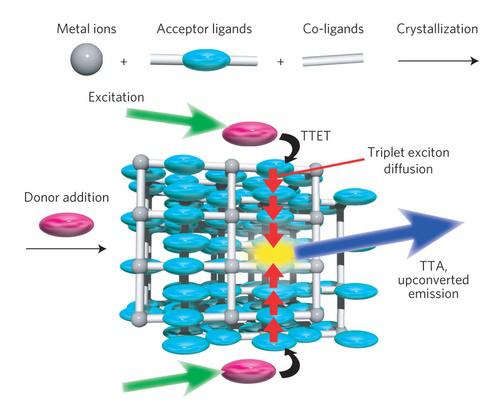 The conversion of low-energy light into photons of higher energy based on sensitized triplet–triplet annihilation upconversion (TTA-UC) has emerged as a promising wavelength-shifting methodology because it permits UC at excitation powers as low as the solar irradiance. However, its application has been significantly hampered by the slow diffusion of excited molecules in solid matrices. Here, we introduce metal–organic frameworks (MOFs) that promote TTA-UC by taking advantage of triplet exciton migration among fluorophores that are regularly aligned with spatially controlled chromophore orientations. We synthesized anthracene-containing MOFs with different molecular orientations, and the analysis of TTA-UC emission kinetics unveiled a high triplet diffusion rate with a micrometre-scale diffusion length. Surface modification of MOF nanocrystals with donor molecules and their encapsulation in glassy poly(methyl methacrylate) (PMMA) allowed the construction of molecular-diffusion-free solid-state upconverters, which lead to an unprecedented maximization of overall UC quantum yield at excitation powers comparable to or well below the solar irradiance.