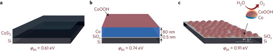 用光电化学法裂解水制氢气和氧气需要有半导体来吸收光子产生电子-空穴对,还需要有催化剂来提高电子在从半导体向溶液中转移的动力。一个重要的问题是,催化剂如何能有效影响半导体中的能带弯曲,进而提高光生电压。 Hill 等人报道了一种简单、廉价的电化学沉积法,来制备用于光催化裂解水的高效的 n-Si/SiOx/Co/CoOOH 光阳极。这个光阳极作为一种固态、金属-绝缘体-半导体光电池,与低过电压的水裂解电化学电池串联在一起。势垒高度与 Co 的覆盖范围相关,厚膜下势垒为 0.74eV ,薄膜下势垒提升到 0.91eV 。这种更大的 势垒使得最终的光生电压提高了360mV。(新材料在线)