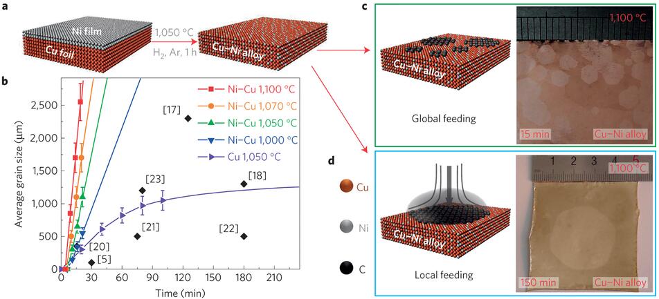 Wafer-scale single-crystalline graphene monolayers are highly sought after as an ideal platform for electronic and other applications1, 2, 3. At present, state-of-the-art growth methods based on chemical vapour deposition allow the synthesis of one-centimetre-sized single-crystalline graphene domains in ~12 h, by suppressing nucleation events on the growth substrate4. Here we demonstrate an efficient strategy for achieving large-area single-crystalline graphene by letting a single nucleus evolve into a monolayer at a fast rate. By locally feeding carbon precursors to a desired position of a substrate composed of an optimized Cu–Ni alloy, we synthesized an ~1.5-inch-large graphene monolayer in 2.5 h. Localized feeding induces the formation of a single nucleus on the entire substrate, and the optimized alloy activates an isothermal segregation mechanism that greatly expedites the growth rate5, 6. This approach may also prove effective for the synthesis of wafer-scale single-crystalline monolayers of other two-dimensional materials.