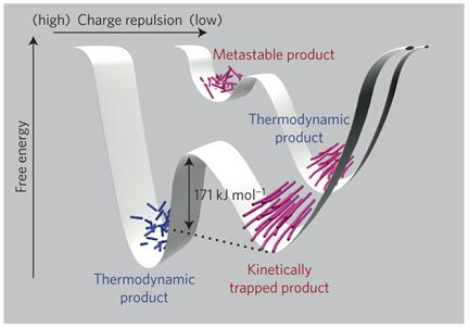 By means of two supramolecular systems—peptide amphiphiles engaged in hydrogen-bonded β-sheets, and chromophore amphiphiles driven to assemble by π-orbital overlaps—we show that the minima in the energy landscapes of supramolecular systems are defined by electrostatic repulsion and the ability of the dominant attractive forces to trap molecules in thermodynamically unfavourable configurations. These competing interactions can be selectively switched on and off, with the order of doing so determining the position of the final product in the energy landscape. Within the same energy landscape, the peptide-amphiphile system forms a thermodynamically favoured product characterized by long bundled fibres that promote biological cell adhesion and survival, and a metastable product characterized by short monodisperse fibres that interfere with adhesion and can lead to cell death. Our findings suggest that, in supramolecular systems, functions and energy landscapes are linked, superseding the more traditional connection between molecular design and function.
