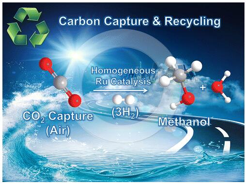 A highly efficient homogeneous catalyst system for the production of CH3OH from CO2 using pentaethylenehexamine and Ru-Macho-BH (1) at 125–165 °C in an ethereal solvent has been developed (initial turnover frequency = 70 h-1 at 145 °C). Ease of separation of CH3OH is demonstrated by simple distillation from the reaction mixture. The robustness of the catalytic system was shown by recycling the catalyst over five runs without significant loss of activity (turnover number > 2000). Various sources of CO2 can be used for this reaction including air, despite its low CO2 concentration (400 ppm). For the first time, we have demonstrated that CO2 captured from air can be directly converted to CH3OH in 79% yield using a homogeneous catalytic system.