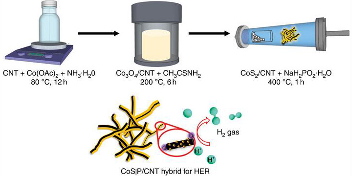 Rational design and controlled synthesis of hybrid structures comprising multiple components with distinctive functionalities are an intriguing and challenging approach to materials development for important energy applications like electrocatalytic hydrogen production, where there is a great need for cost effective, active and durable catalyst materials to replace the precious platinum. Here we report a structure design and sequential synthesis of a highly active and stable hydrogen evolution electrocatalyst material based on pyrite-structured cobalt phosphosulfide nanoparticles grown on carbon nanotubes. The three synthetic steps in turn render electrical conductivity, catalytic activity and stability to the material. The hybrid material exhibits superior activity for hydrogen evolution, achieving current densities of 10 mA cm-2 and 100 mA cm-2 at overpotentials of 48 mV and 109 mV, respectively. Phosphorus substitution is crucial for the chemical stability and catalytic durability of the material, the molecular origins of which are uncovered by X-ray absorption spectroscopy and computational simulation.