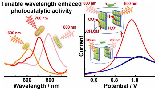 Photocatalysis is a promising technology for renewable energy production. Many photocatalysis have realized the visible-light-driven catalytic activity. However, it is still difficult to achieve the enhanced photocatalytic activity with tunable wavelength. We have designed tunable wavelength enhanced photoelectrochemical cells by tuning the surface plasmon resonance (SPR) peaks, which can be controlled by the aspect ratios of the Au nanorods, for both the cathode with the hydrogen evolution reaction and the anode with the electrooxidation of methanol reaction. The optimal photocatalytic activity of the hydrogen evolution and electrooxidation of the methanol can be realized only when the illuminating wavelength matches with the SPR peaks, which is quite selective to the illuminating wavelength. The blue shift of the SPR peak increases the photoelectrocatalytic effect whereas the red shift enhances the photothermal effect. Such studies provide a useful way for improving the photocatalytic activity and the selectivity of the photocatalytic reactions by adjusting the illuminating wavelength.
